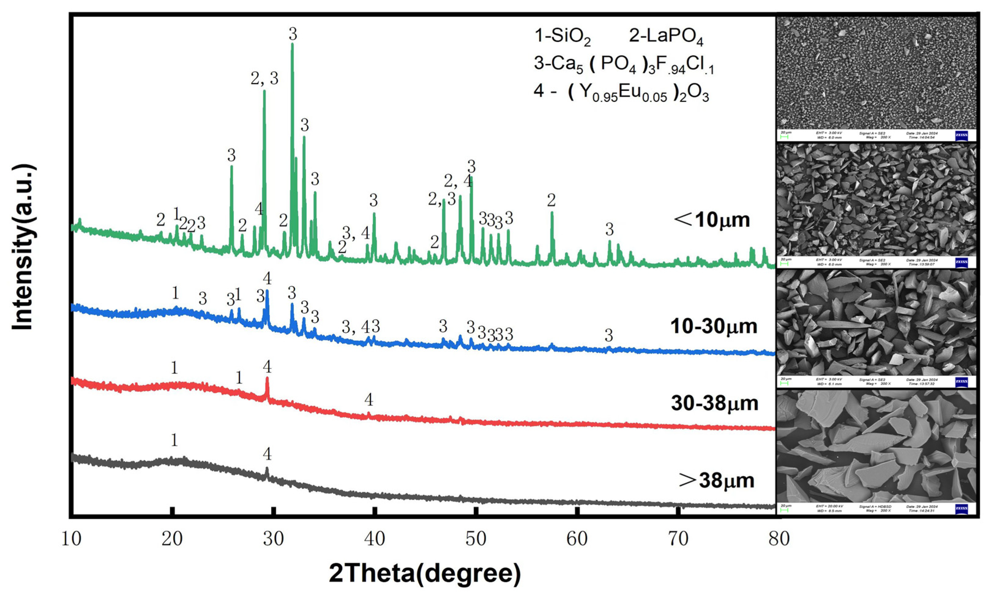 - Pre-enrichment—screening and desilication: After screening with a 30-micron sieve, approximately 17.9% of the glass fragments were removed. At the same time, the grade of the waste phosphor (REO) increased from 9.3% to 10.9%.