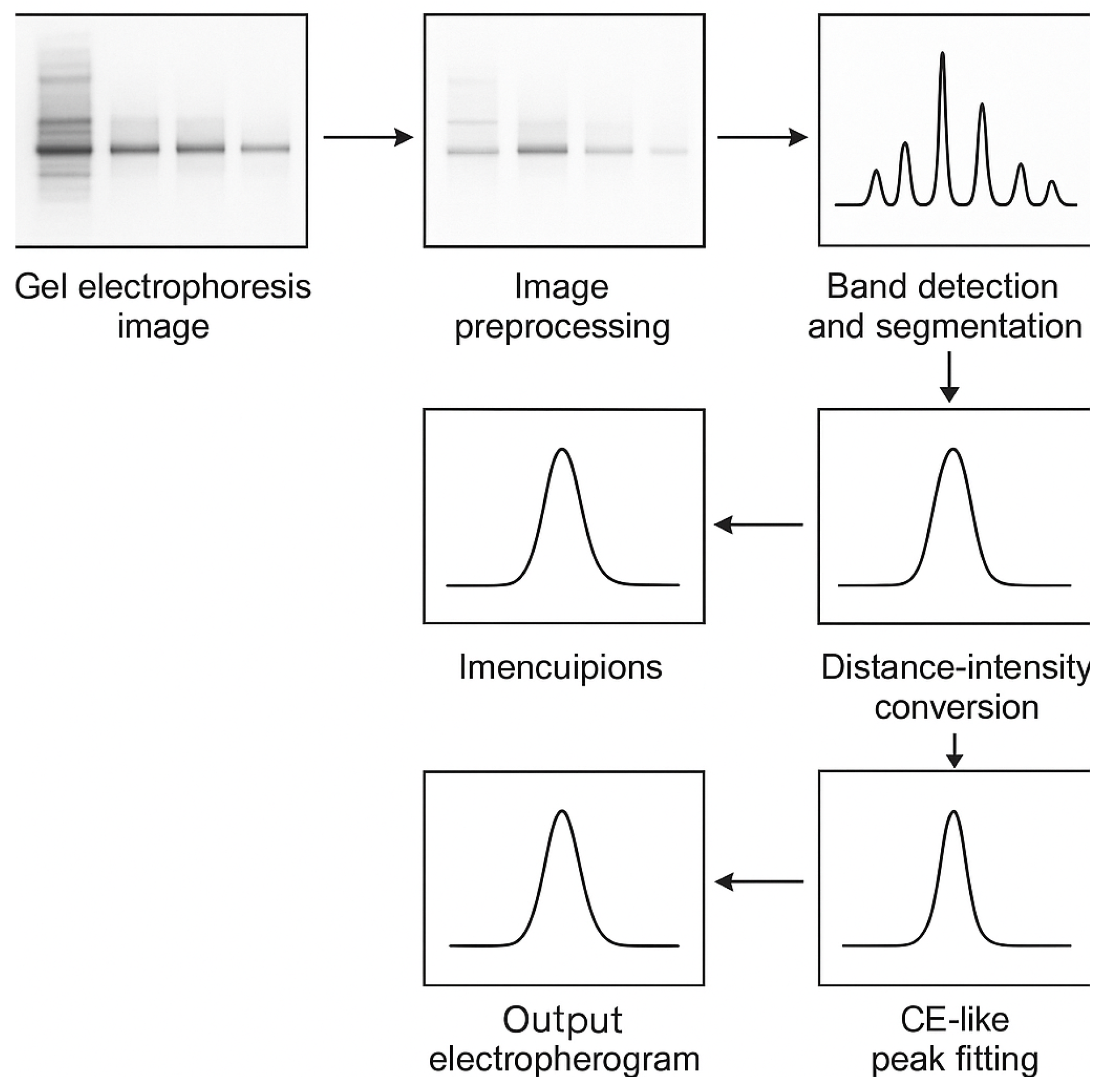 Figure 1. Workflow of gel electrophoresis image processing and conversion to CE-like electropherogram.