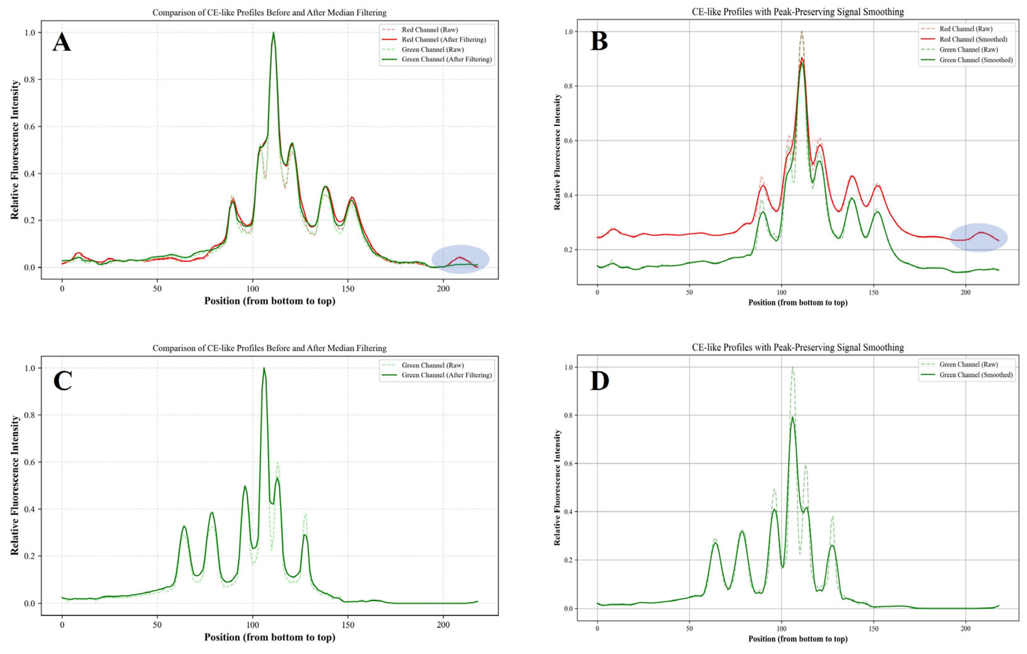 Figure 3 represents a transformation of a GE image into profiles similar to those generated by CE. The conversion was conducted using two key image processing techniques: median filtering and peak-preserving smoothing. These methods are supposed to reduce noise and improve the clarity of the electrophoresis profiles, particularly in the context of fluorescence-based intensity measurements. Data in Figure 3A showed the red and green channel profiles of the electrophoresis data before and after filtering. The red channel, in particular, presents an anomaly. A peak marked with ellipse that is not expected in the GE. This peak could potentially be caused by noise in the image data or artifact due to the imaging system. This unexpected peak is observed in both the raw and filtered profiles, suggesting that the median filtering method did not fully eliminate this artifact. Median filtering, while effective in removing small noise and smoothing the signal, might not be sufficient in eliminating large or sharp anomalies such as this false peak. The filtering process was intended to enhance the general trend of the electrophoresis profiles while retaining major peaks that signify biological or chemical events. However, the results show that this method fails to address the presence of the unknown peak in the red channel effectively. Thus, we selected the green channel for subsequent analysis.