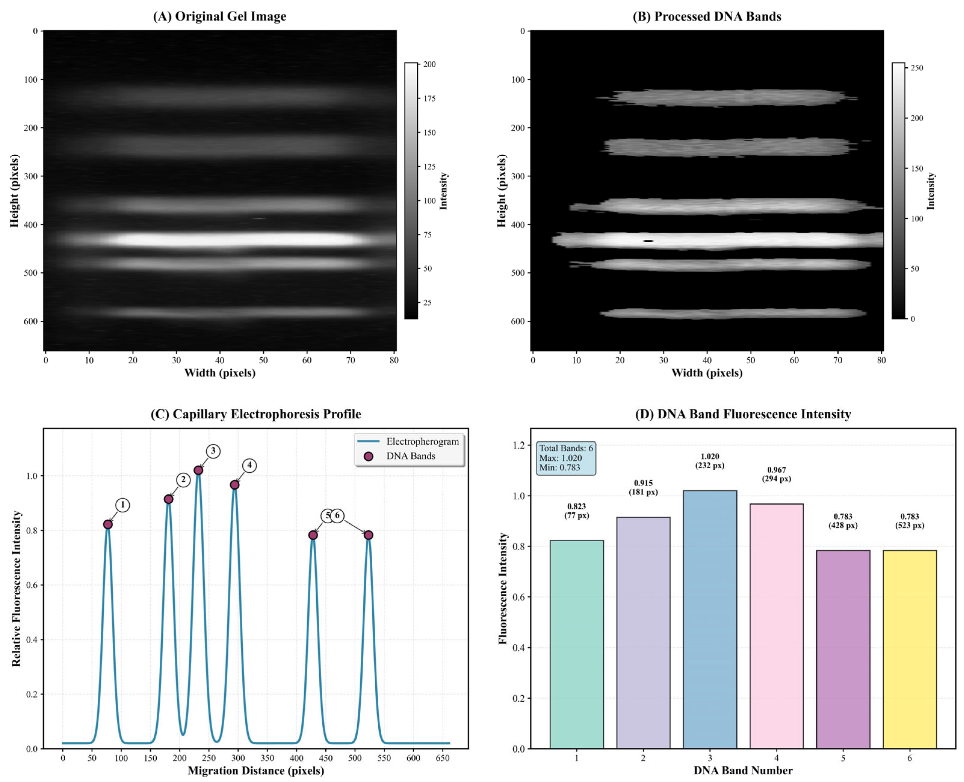 While GE image provides a general overview of the gel, it lacks sufficient contrast and resolution for precise analysis. To extract meaningful quantitative information (e.g., the size distribution and relative abundance of DNA fragments) from the gel images. We employed image enhancement, DNA band isolation, peak detection, and the creation of CE profiles to realize semi-quantitative analysis of DNA by GE. Figure 4A shows the original cropped gel image in grayscale. It serves as the baseline for all subsequent processing. The DNA bands, which appear as dark vertical stripes on the gel, are the primary focus of the analysis. The ability to select a specific ROI is crucial, as it ensures that only the area containing relevant DNA bands is processed. This step minimizes the risk of including extraneous data that could lead to erroneous results. Figure 4B presents the image after a series of image processing steps, which include contrast limited adaptive histogram equalization, sharpening, and Gaussian blur. These steps significantly improve the contrast between the DNA bands and the background, making the bands more distinct and easier to detect. Contrast limited adaptive histogram equalization, in particular, enhances local contrast and ensures that subtle variations in intensity are captured, even in regions with low signal-to-noise ratios. The sharpened image highlights the DNA bands, which are then extracted using a binary mask. Morphological operations—such as opening and closing—help to refine the mask, removing any small noise and ensuring that only the bands of interest remain. This clean, processed image forms the foundation for the subsequent steps of peak detection and intensity profiling. By isolating the DNA bands from the rest of the gel, we avoid including irrelevant background noise in the analysis, ensuring that only the true bands are considered when calculating the intensity profile. Figure 4C presented the CE profile, derived from the intensity profile of the gel. In this profile, the x-axis represents the migration distance (in pixels), while the y-axis represents the relative fluorescence intensity of each position along the gel. The intensity of each pixel is summed along the gel’s width to generate this profile, and the peaks in the profile correspond to the positions of the DNA bands. The CE profile is critical for understanding the migration behavior of DNA fragments. The peaks detected in this profile correspond to the separation of DNA fragments based on size: smaller fragments migrate faster, while larger fragments move slower. The resolution of these peaks is essential for accurate identification of DNA bands, especially when the bands are closely spaced. To detect the peaks, we applied a peak resolution method. It identifies local maxima in the smoothed intensity profile, with adjustable parameters for prominence, distance, and width to fine-tune peak detection. The prominence ratio, which is set at 0.08 in the script, ensures that only prominent peaks—those that represent true DNA bands—are detected, filtering out noise and minimizing false positives. The smoothed intensity profile provides a clearer representation of the DNA separation, and the detected peaks accurately represent the positions and intensities of the bands in the gel.