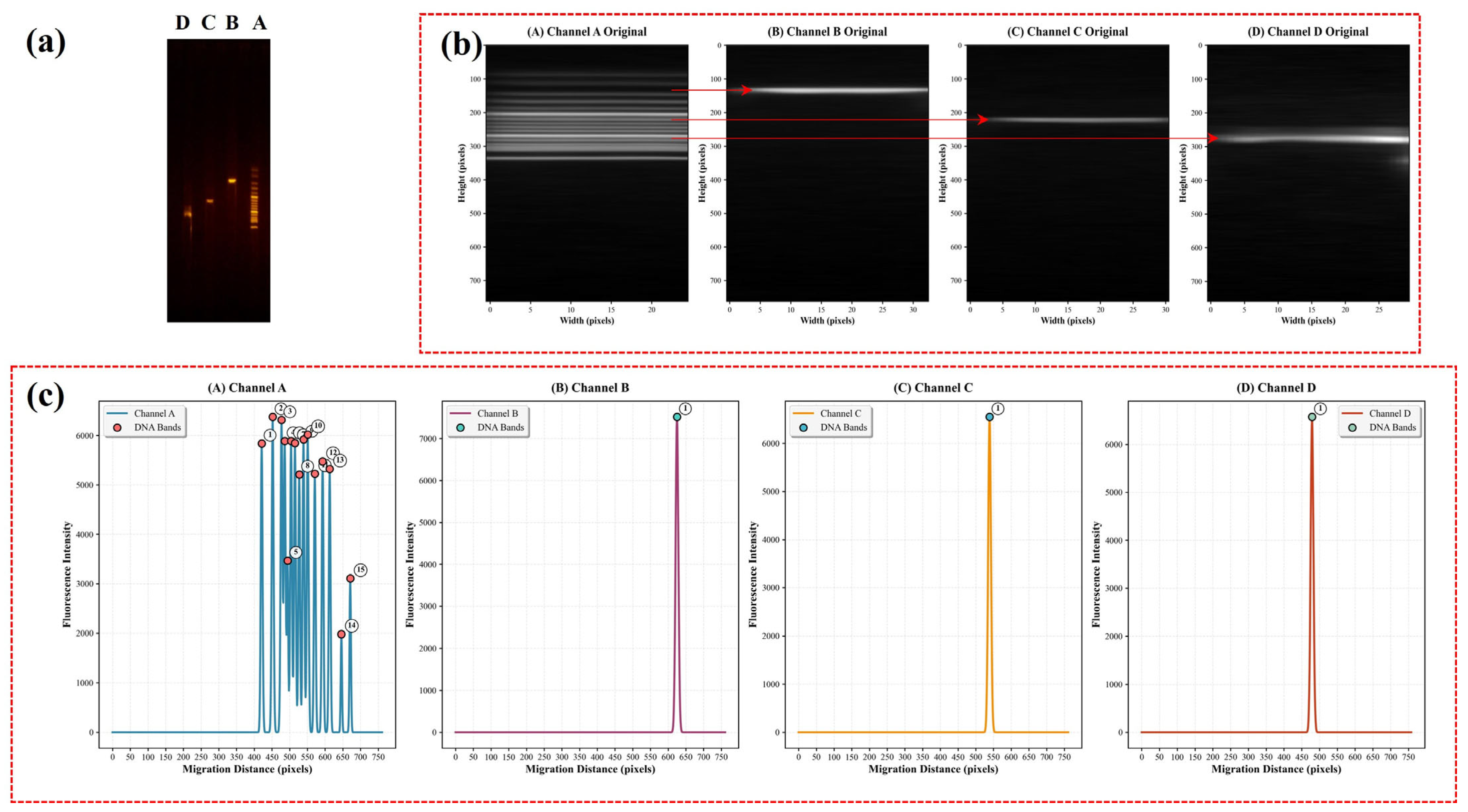 To validate our methods for transformation from a GE image to a CE-like profile, we have carried out the GE of three periodontal pathogens—Porphyromonas gingivalis (P.g), Treponema denticola (T.d), and Tannerella forsythia (T.f)—following PCR amplification. Figure 5a shows the agarose GE image, in which the four channels, from left to right, correspond to T.f, T.d, P.g, and the 50 bp DNA ladder, respectively. The distinct bright bands observed in each lane confirm successful amplification of the target fragments. The band patterns of the three bacteria differ in position and intensity, reflecting differences in amplicon length and fluorescence concentration. Figure 5b illustrates the processed electrophoretic images obtained through image analysis algorithms. The algorithm extracts and enhances the fluorescence intensity distribution of each channel, converting the 2D band image into a 1D grayscale representation. Channels A–D correspond, respectively, to the 50 bp DNA ladder, P.g, T.d, and T.f. Through filtering and normalization, the signal-to-noise ratio of each electrophoretic channel is significantly improved, enabling clearer differentiation of DNA bands. The ladder channel (A) shows a series of regularly spaced horizontal bands, consistent with the expected fragment intervals of 50 bp increments. The other three bacterial channels exhibit single, high-intensity bands, indicating that each PCR reaction yielded a specific and unique amplicon without non-specific amplification or primer-dimer formation.