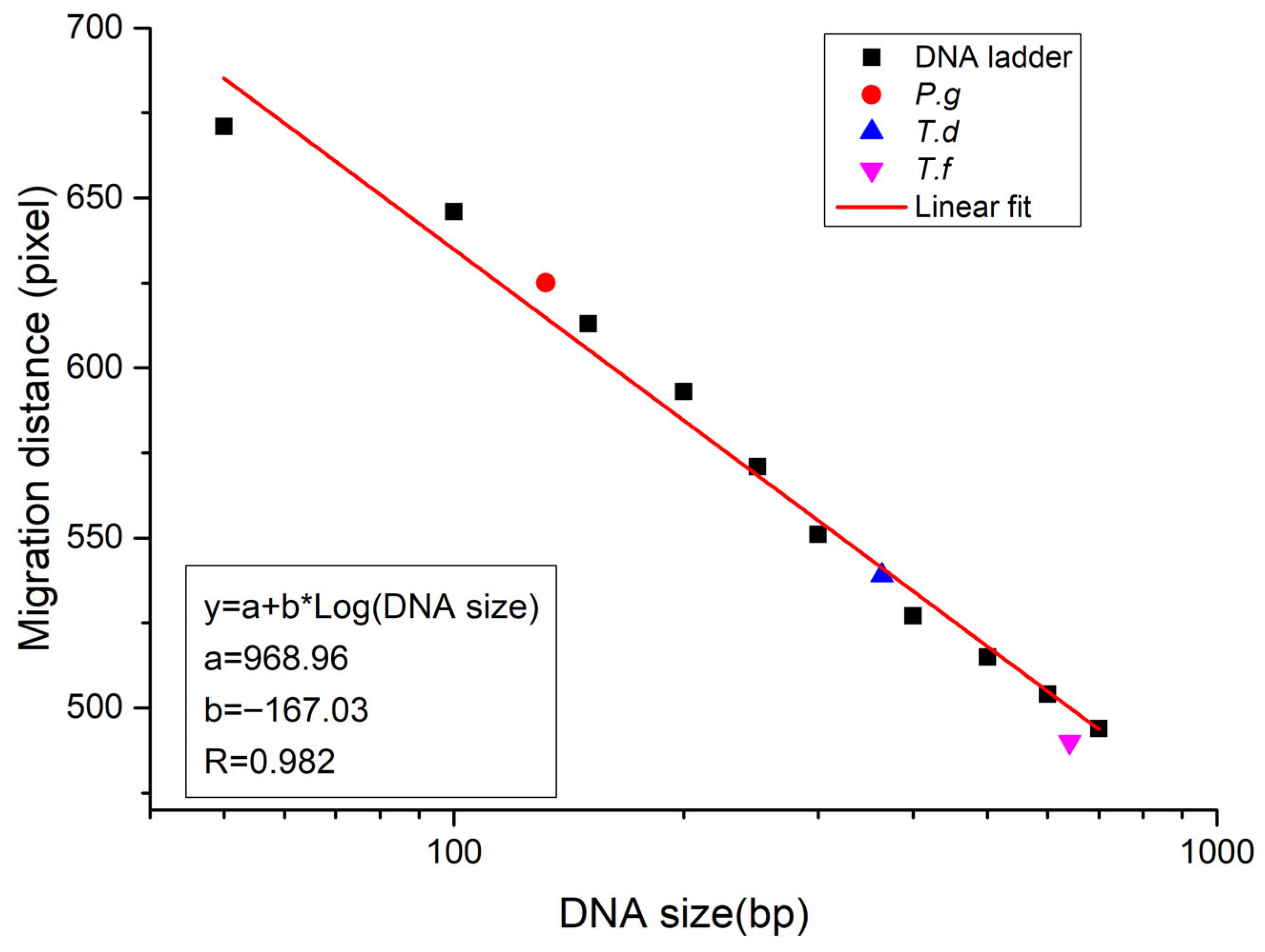 Furthermore, we also employed formula (1) to evaluate the estimated size of the amplicon, and the result is shown in Figure 6. It demonstrated that the migration distance was linearly related with the logarithmic value of DNA size. The correlation coefficient was about 0.982, and the amplicon was around the linear fitting line. The relative fluorescence intensity calculated from Figure 5c(B–D) was about 7517, 6550 and 6572, respectively. They are corresponding to the PCR products of P.g, T.d, and T.f. They can be used to evaluate the concentration by comparing the value with DNA ladders.
