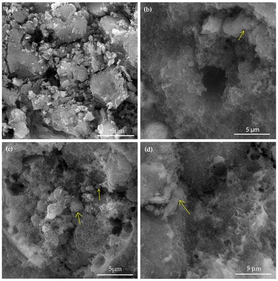 Scanning electron microscopy (SEM) was used to investigate the surface morphology and structure of the geopolymer samples, as presented in Figure 1.