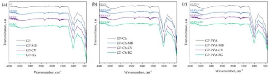 FTIR spectra of (a) GP, (b) GP-Ch, and (c) GP-PVA materials before and after dye adsorption.