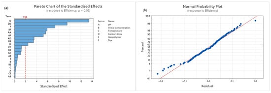 (a) Pareto diagram—Effect of adsorption parameters on process efficiency. (b) Normal Probability Plot.