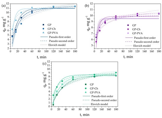 The correlation coefficient values (R2) given in Table 1 indicate that the adsorption of MB and CV on the GP sample followed the Elovich kinetic model, while BG followed the pseudo-second-order kinetic model. Modification of the material with chitosan (GP-Ch) led to a change in the adsorption kinetics of all investigated analytes, which then followed the pseudo-second-order kinetic model. Unlike the chitosan modification, modification with polyvinyl alcohol (GP-PVA) only altered the adsorption kinetics of MB to the pseudo-second-order model, while the adsorption kinetics of CV and BG remained the same as the unmodified GP material. Furthermore, applied modifications increased the adsorption capacities in all investigated cases, with the PVA modification having a more powerful effect. The adsorption capacities obtained experimentally (qexp) did not significantly deviate from the ones theoretically obtained using the pseudo-first and pseudo-second order kinetics. Since in all investigated cases the correlation coefficient value obtained by fitting with the Elovich model was higher than 0.9, the process can be well-described by this model. The coefficient α represents the parameter related to the adsorption process, while β represents the parameter related to the desorption process. As in all cases α > β, this process occurred efficiently.