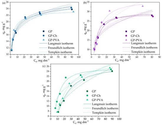 Figure 8 shows the influence of the initial concentration on the adsorption capacities of the examined geopolymers. The adsorption capacity was observed to increase with the initial dye concentration, while the efficiency of the adsorption process decreased (Figure S5). In the examined initial concentration range, the characteristic plot was not reached, indicating the lack of surface saturation, however, the obtained equilibrium adsorption capacities ranged from 23.81 mg g−1 to 28.08 mg g−1 for GP, from 24.36 mg g−1 to 27.52 mg g−1 for GP-Ch, and from 23.08 mg g−1 to 32.90 mg g−1 for GP-PVA. For a better understanding of the interaction between adsorbate and adsorbent, the experimentally obtained equilibrium adsorption data were analyzed using selected adsorption isotherm models. Experimental data fitting with the Langmuir, Freundlich, and Temkin adsorption isotherms are shown in Figure 8, while Table 2 summarizes the isotherm parameters.