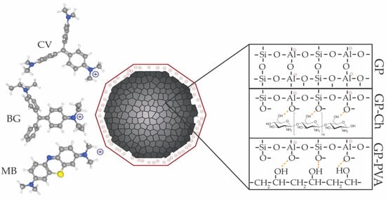 The influence of the geopolymer modification with chitosan and PVA on the surface charge of the obtained materials was examined by determining the point of zero charge (Figure S2). The point of zero charge (PZC) represents the pH value of a solution at which the surface charge of the material is neutral [42]. The measured PZC values were very close, reflecting the similar preparation procedures used for all materials: 6.07 for GP, 6.20 for GP-Ch, and 6.45 for GP-PVA. At pH values above 6.5, deprotonation of functional groups occurred, resulting in a negatively charged surface. Conversely, at pH values below 6, protonation predominated, and the surface became positively charged. Given that the pH of the dye solutions was 6.5 for methylene blue, 7.9 for crystal violet, and 6.7 for brilliant green, in the dye solutions without pH adjustment, the geopolymers behaved as negatively charged. Since methylene blue, crystal violet, and brilliant green are cationic dyes (Figure S1), we can safely anticipate that they will demonstrate high adsorption efficiency on the synthesized materials.