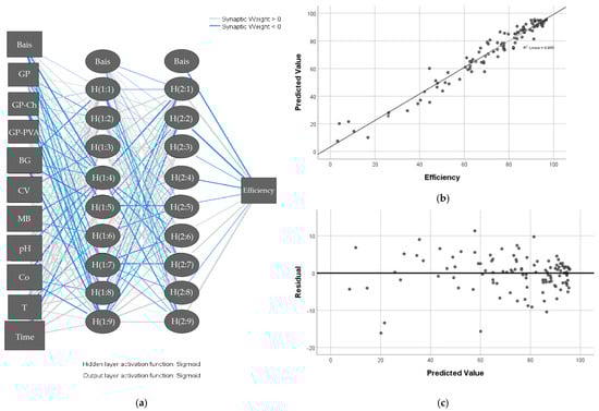 Artificial neural networks represent a complex computational model, which, unlike all others, assumes a nonlinear correlation between parameters. Similar to the human brain, it has the ability to learn. The type of network used for data processing is feed-forward, while the type of learning used is backpropagation [42]. The dye concentrations after adsorption, under different conditions, were in the input layer, whereas the materials that were used as adsorbents, as well as the parameters of adsorption (pH, Co, T and t), were in the output layer (Figure 11a). The artificial neural network automatically selected two units in the hidden layer with 9 units in both hidden layers after several iterations (training and testing). The Sigmoid activation function was used in the input and output layers, as required when designing the network. The network will strive to keep the sum of squared error as small as possible. With several iterations, the network reported that the sum of squared errors was 0.081 for testing and 0.058 for training. The dye concentrations after adsorption, the materials that were used as adsorbents, as well as the parameters of adsorption (pH, Co, T and t), were in the input layer, whereas adsorption efficiency was in the output layer as a dependent variable (Figure 11a).