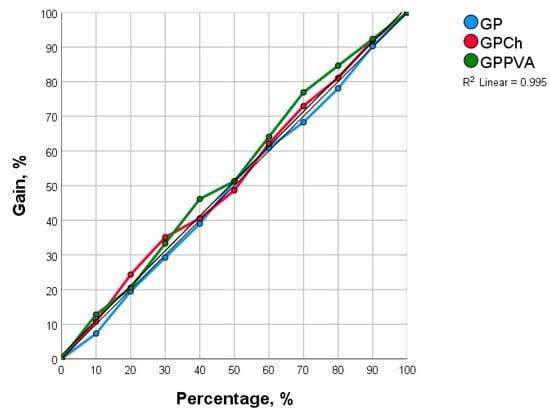 The graphical interpretation of the obtained equations is illustrated for sample GP-Ch since this sample showed the highest efficiency in dye adsorption. The graphical interpretation of the equations obtained for the adsorption of methylene blue onto GP-Ch is given in Figure 5, while the graphics for crystal violet and brilliant green are presented in Figures S2 and S3.