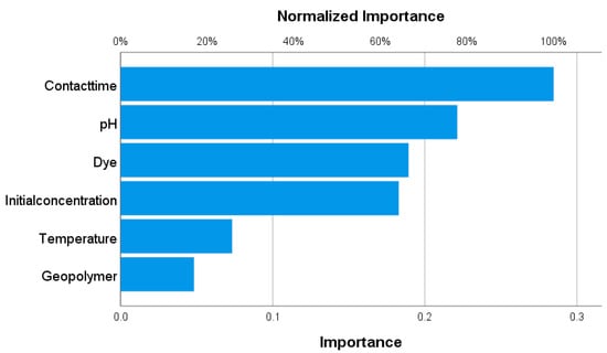 The ANOVA test results indicate that the obtained model was statistically significant, as reflected by the F-value of 37.35 and the p-value of <0.001. The model error was low (0.0055), suggesting that the proposed model can adequately describe the experimental data. The Normal Probability Plot shows that the residuals were normally distributed, further supporting these findings, while also revealing that model errors were most pronounced at very low and very high adsorption efficiency values. Both the Pareto chart and the ANOVA test confirmed that the factors with the greatest influence on the adsorption process were contact time (F = 181.89) and the organic dye used in this process (F = 39.70). In addition, significant effects were observed for the square terms (t2, pH2, C02, T2) and for two-way interactions (pH–t, pH–Dye, C0–Dye, Geopolymer–Dye), while other interactions were not statistically significant. The obtained models in the form of equations are presented in Table S4. Overall, the results clearly demonstrate that contact time exerts the most significant influence on the adsorption process.