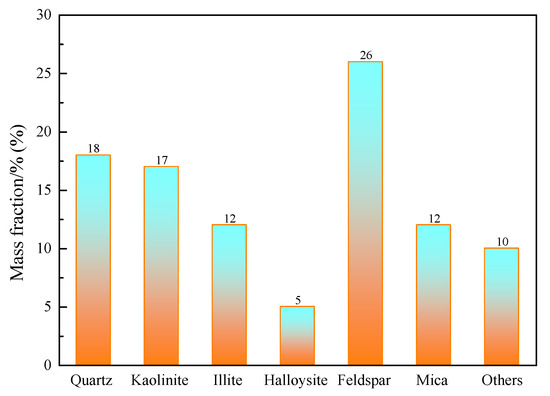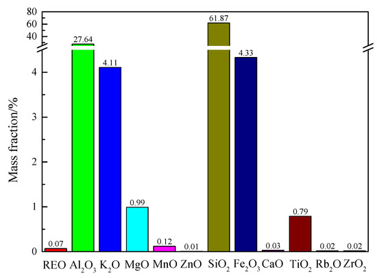 The WREO samples used in the experiment were collected from Jiangxi province, China. The chemical composition of the WREO sample is shown in Figure 1. Analysis of the ore sample shows its composition includes 0.07% REO. Additionally, the ore sample has a high Al2O3 content of 27.64%. Minerals in the WREO sample are shown in Figure 2. Feldspar, quartz, and kaolinite were the dominant minerals in the ore, collectively accounting for over 60% of its composition. Ammonium sulfate, iron(III) chloride hexahydrate, Nessler’s reagent, and potassium sodium tartrate tetrahydrate were purchased from Sinopharm Chemical Reagent Co., Ltd., located in Shanghai, China, and are of analytical grade. Additionally, all solutions were prepared using deionized water.