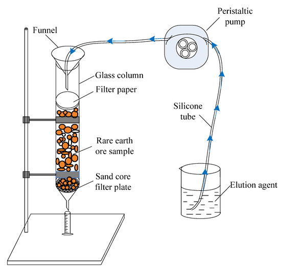 A peristaltic pump was used to inject the eluent from the top of the column at a constant flow rate, thereby eluting the RE ore tailings. The eluate was then gathered for analysis. The entire process was performed at an ambient temperature of 25 ± 0.5 °C.