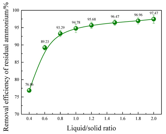 Figure 5 illustrates the influence of the liquid/solid ratio on the ammonium removal process. As depicted, an initial rapid increase in the removal efficiency of residual ammonium salt is observed with the rise in the liquid/solid ratio, followed by a slower rate of increase until it eventually reaches a state of equilibrium. A higher liquid/solid ratio facilitates more frequent interactions between the ore particles and the electrolyte iron ions present in the eluent, thereby enhancing the exchange reaction between these iron ions and the residual ammonium, resulting in an elevated removal efficiency. However, an excessively high eluent volume may lead to resource wastage. Notably, when the liquid/solid ratio is maintained at 2:1 mL/g, the removal efficiency of residual ammonium is considered to have reached equilibrium, with a recorded efficiency of 97.47% for ammonium extraction from rare earth ore using ferric chloride.