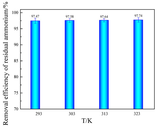 The effect of temperature on the ammonium removal process is presented in Figure 6. As depicted in the figure, an increase in temperature corresponds with a slight enhancement in the removal efficiency of RA in RE ore. However, this change is not pronounced. The phenomenon may be attributed to the strong exchange capacity of iron ions present during the process. Furthermore, the concentrations and liquid/solid ratios of the eluent utilized in the experiment are relatively high when compared to the residual ammonium salts found in the rare earth ore, which likely contributes to the limited impact of temperature on the removal efficiency. Notably, the removal efficiency of RA consistently exceeds 97%.