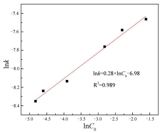 The apparent rate constants k and corresponding initial elution concentrations from Table 1 were substituted into Equation (8), and the resulting data are illustrated in Figure 8. As demonstrated in Figure 8, the linear relationship between lnk and lnC0 (R2 > 0.97) indicates that the reaction process of residual ammonium in the ore tailing with ferric salt is controlled by internal diffusion.