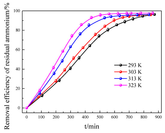 The influence of temperature on the elution kinetics of residual ammonium in the ore tailing, using ferric chloride as the eluent, was systematically investigated. As shown in Figure 9, the removal efficiency of residual ammonium increases progressively over time and is enhanced when the temperature increases. This is because the higher the temperature, the higher the activity of ions in the reaction system, the greater the reaction intensity, and the stronger the anisotropic diffusion ability of the solution, so the elution rate of the residual ammonium in the ore tailing is faster. Therefore, it is obvious that the operation at high temperature is beneficial to the elution of RA from RE ore tailings.