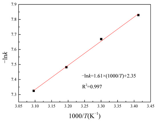 The relationship between lnk and 1/T has been illustrated using the apparent rate constants derived from Table 2, as depicted in Figure 10. From the figure, it is evident that a strong linear correlation exists between lnk and 1/T, with fitting coefficients R2 exceeding 0.98.