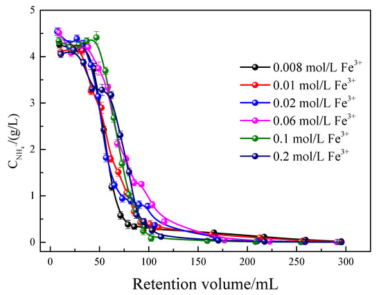 Figure 11 depicts the influence of ferric salt concentration on the mass transfer process during the elution of residual ammonium by ferric chloride. Figure 11 indicates that a higher iron ion concentration in eluent corresponds to a higher ammonium concentration in the eluate during the initial equilibrium stage. This is because a high concentration of iron ions in the eluent facilitates the ion exchange process in two ways: firstly, it directly increases the rate of exchange with the adsorbed ammonium ions, and secondly, it creates a larger concentration gradient for the displaced ammonium ions, which in turn accelerates their diffusion into the flowing liquid film. When the concentration of iron ions in the eluent is high, the exchange rate between iron ions and ammonium ions adsorbed by ore particles increases, and the diffusion rate of the replaced ammonium ions to the flowing liquid layer is accelerated due to the concentration difference. Therefore, when the concentration of iron ions is elevated, the concentration of ammonium ions in the eluate experiences a slight increase. As the eluate continues to flow out, however, the concentration of ammonium ions diminishes sharply and ultimately gradually approaches zero, reaching a state of elution equilibrium. Specifically, when the concentration of ferric chloride was set at 0.06, 0.10, and 0.20 mol/L, the recorded ammonium levels in at the final stage leachate were 1.85, 1.69, and 1.90 mg/L, respectively. The measured pollution level falls within the rare earth industry’s standard, which is set at 15 mg/L. Therefore, it can be concluded that ferric salts are effective in eluting residual ammonium from tailings, thereby mitigating the potential for slow-release pollution associated with ammonia nitrogen.