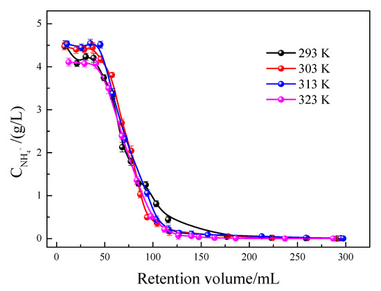 Figure 12 illustrates the effect of temperature on the elution curve of residual ammonium from the RE ore. As temperature increases, the elution rate of RA increases. Concurrently, the volume of eluate required to reach equilibrium decreases. This is mainly due to the increased driving force of reactions between ions under high temperature conditions, resulting in an accelerated elution rate of RA. When the eluting temperature was 293 K, 303 K, 313 K, and 323 K, the concentration of ammonium ion in the final stage leachate was 1.85, 1.59, 3.11, and 0.85 mg/L, respectively. Following the leaching process, the exchangeable ammonium content in the RE ore was substantially reduced to very low levels. Over time, physical and chemical processes like rainwater leaching and microbial activity will significantly reduce the concentration of ammonia nitrogen, resulting in minimal environmental impact. Additionally, the extremely low residual ammonia nitrogen within the ore body will provide essential nutrients necessary for plant growth [27].