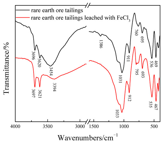 The Infrared spectrum analysis of the rare earth tailings, both pre- and post-ammonium elution with ferric chloride, were investigated, and the comparative results are shown in Figure 13. It can be seen that there are three significant absorption peaks near 3696 cm−1, 3620 cm−1, and 3454 cm−1, which are mainly attributed to the internal hydroxyl vibration of clay minerals in rare earth ores. A significant absorption peak appeared at 1386 cm−1 in the infrared spectrum of rare earth tailings without using ferric chloride to elute residual ammonium. This was caused by N-H bending vibration acting on clay minerals, which can clearly characterize the NH4+ in the structure of rare earth tailings. However, in the infrared spectrum of the residual ammonium salt ore sample eluted with ferric chloride, the absorption peak near 1386 cm−1 disappeared, indicating that ferric chloride has effectively eluted and removed the RA in the RE tailings. Clay minerals are an important component of rare earth ores. The infrared spectrum of the rare earth ores reveals several distinctive absorption bands. A prominent peak near 1031 cm−1 is attributed primarily to the Si-O stretching vibration in clay minerals and feldspar in rare earth ores. Similarly, the band at 911 cm−1 arises mainly from the O-H vibration within the clay minerals. Furthermore, two adjacent peaks located at 760 cm−1 and 695 cm−1 are assigned to the stretching and parallel vibrations of Si-O-Al and Si-O-Si in the layered silicates of rare earth clay minerals. Finally, the spectral features observed at 536 cm−1 and 469 cm−1 are predominantly due to the bending vibration of Si-O and the stretching vibration of Al-O in the clay mineral components.