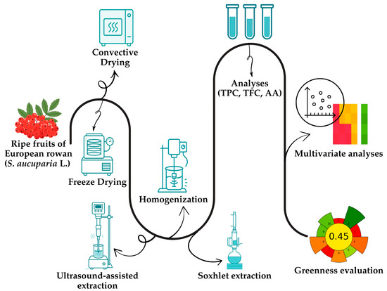Herein, the current study intends to address this gap. This study aimed to compare various pre-treatment methods for rowan fruits and assess different extraction techniques to determine their impact on the recovery of phenolic compounds. The hypothesis proposed that the amount of phenolics recovered depends on the drying method used for the raw material and the specific extraction process and conditions. To verify this, fruits were pre-treated with convective drying or freeze-drying, followed by extraction using homogenizer-assisted, Soxhlet, or ultrasound-assisted methods. The resultant extracts were analyzed spectrophotometrically to quantify total phenolic and flavonoid contents and to evaluate antioxidant activity against DPPH radicals, enabling a comparison of the effectiveness across the different methods.