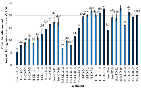 Total phenolic content (TPC; mg of chlorogenic acid equivalents per g dry weight) in rowanberry (S. aucuparia L.) fruit extracts obtained by mechanical homogenization in ethanol (H), ultrasonic homogenization (US), or continuous Soxhlet extraction (Sox). Raw materials: convectively dried (CD) and freeze-dried (FD). Control samples were vigorously mixed in ethanol using a vortex for 2 min (Control-CD, Control-FD). Homogenization settings: 5 and 10 = 5000 and 10,000 rpm; 1, 2, 5 = minutes. Ultrasonic settings: 20 and 80 = 20% and 80% amplitude; 2 and 5 = minutes. Soxhlet settings: 4, 8, 12, 16 = number of solvent cycles. Bars show mean ± SD. Different lowercase letters (a–m) denote significant differences among treatments (Tukey’s HSD, α = 0.05).