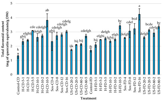 Total flavonoid content (TFC; mg of quercetin equivalents per g dry weight) in rowanberry (S. aucuparia L.) fruit extracts obtained by mechanical homogenization in ethanol (H), ultrasonic homogenization (US), or continuous Soxhlet extraction (Sox). Raw materials: convectively dried (CD) and freeze-dried (FD). Control samples were vigorously mixed in ethanol using a vortex for 2 min (Control-CD, Control-FD). Homogenization settings: 5 and 10 = 5000 and 10,000 rpm; 1, 2, 5 = minutes. Ultrasonic settings: 20 and 80 = 20% and 80% amplitude; 2 and 5 = minutes. Soxhlet settings: 4, 8, 12, 16 = number of solvent cycles. Bars show mean ± SD. Different lowercase letters (a–k) denote significant differences among treatments (Tukey’s HSD, α = 0.05).