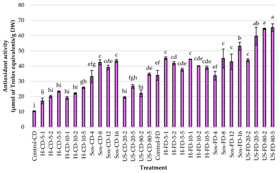 Antioxidant activity (DPPH assay; μmol of Trolox equivalents per g dry weight) in rowanberry (S. aucuparia L.) fruit extracts obtained by mechanical homogenization in ethanol (H), ultrasonic homogenization (US), or continuous Soxhlet extraction (Sox). Raw materials: convectively dried (CD) and freeze-dried (FD). Control samples were vigorously mixed in ethanol using a vortex for 2 min (Control-CD, Control-FD). Homogenization settings: 5 and 10 = 5000 and 10,000 rpm; 1, 2, 5 = minutes. Ultrasonic settings: 20 and 80 = 20% and 80% amplitude; 2 and 5 = minutes. Soxhlet settings: 4, 8, 12, 16 = number of solvent cycles. Bars show mean ± SD. Different lowercase letters (a–j) denote significant differences among treatments (Tukey’s HSD, α = 0.05).
