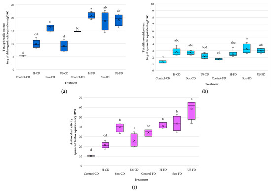 Box-and-whisker summaries for rowanberry (S. aucuparia L.) extracts prepared from convectively dried (CD) or freeze-dried (FD) fruit by mechanical homogenization in ethanol (H), ultrasonication (US), or Soxhlet extraction (Sox): (a) Total phenolic content (TPC), (b) Total flavonoid content (TFC), and (c) Antioxidant activity by DPPH assay. Controls were vortex-mixed in ethanol for 2 min (Control-CD, Control-FD). Boxes = interquartile range (IQR), center line = median, whiskers = min–max, “×” = mean. Different lowercase letters (a–d) above boxes indicate significant differences among treatments within each panel (Tukey’s HSD, α = 0.05).