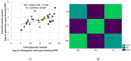 Correlations among total phenolic content (TPC), total flavonoid content (TFC), and antioxidant activity (AA; DPPH assay) for rowanberry (S. aucuparia L.) extracts, i.e., (a) AA vs. TPC, (b) AA vs. TFC, (c) TFC vs. TPC, and (d) Heatmap of Pearson correlation coefficients (R) for TPC, TFC, and AA. Each point represents one extract, while the dashed line is the least-squares linear fit. Reported in-panel are the Pearson correlation coefficient (R) and the coefficient of determination (R2). Color coding for panels (a–c): black—Control-CD; white—Control-FD; grey—H-CD; purple—H-FD; dark blue—US-CD; green—US-FD; yellow—Sox-CD; red—Sox-FD. Abbreviations: CD—convectively dried; FD—freeze-dried; H—mechanical homogenization; US—ultrasonic homogenization; Sox—Soxhlet extraction.