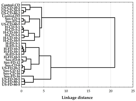Hierarchical cluster analysis (HCA) dendrogram of the compared rowanberry (S. aucuparia L.) extracts, constructed with Ward’s linkage and Euclidean distances from TPC, TFC, and DPPH antioxidant activity values. Labels denote process and material: H—mechanical homogenization; US—ultrasonic homogenization; Sox—Soxhlet; CD—convectively dried; FD—freeze-dried. Control samples were vigorously mixed in ethanol using a vortex for 2 min (Control-CD, Control-FD). Homogenization settings: 5 and 10 = 5000 and 10,000 rpm; 1, 2, 5 = minutes. Ultrasonic settings: 20 and 80 = 20% and 80% amplitude; 2 and 5 = minutes. Soxhlet settings: 4, 8, 12, 16 = number of solvent cycles.