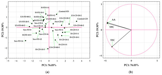 Principal component analysis (PCA) of rowanberry (S. aucuparia L.) extracts based on total phenolic content (TPC), total flavonoid content (TFC), and DPPH antioxidant activity (AA). Sample codes: H—mechanical homogenization; US—ultrasonic homogenization; Sox—Soxhlet; CD—convectively dried; FD—freeze-dried. Controls were vortex-mixed for 2 min (Control-CD, Control-FD). (a) Scores plot (PC1 = 76.05%; PC2 = 19.30%) showing the distribution of individual extracts. (b) Loading circle for PC1 vs. PC2.