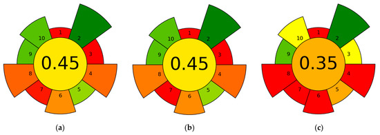 AGREEprep assessment of the greenness of the three extraction workflows for rowanberry (S. aucuparia L.) fruits: (a) mechanical homogenization in ethanol (H), (b) ultrasonic homogenization (US), and (c) Soxhlet extraction (Sox).