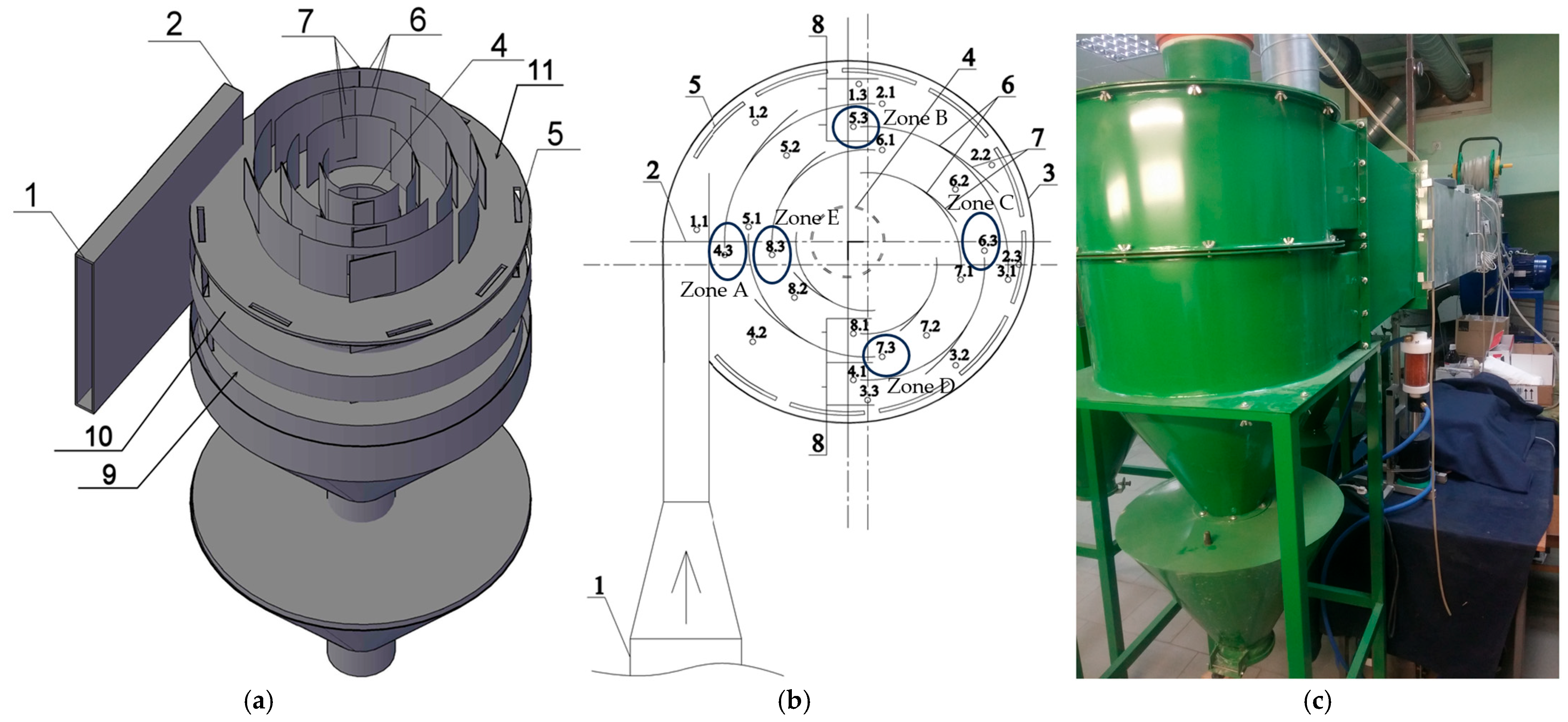 Gas flow velocities were investigated in the cyclone-separator channels using a Pitot tube at different heights (2 cm above the bottom of the separation chamber, in the middle of the channel height, and 2 cm below the separation chamber cover). Aerodynamic resistance was measured using a DSM-1 (Elintos MS, Vilnius, Lithuania) differential pressure gauge (measuring range 0–20,000 kPa; accuracy ±5 Pa).