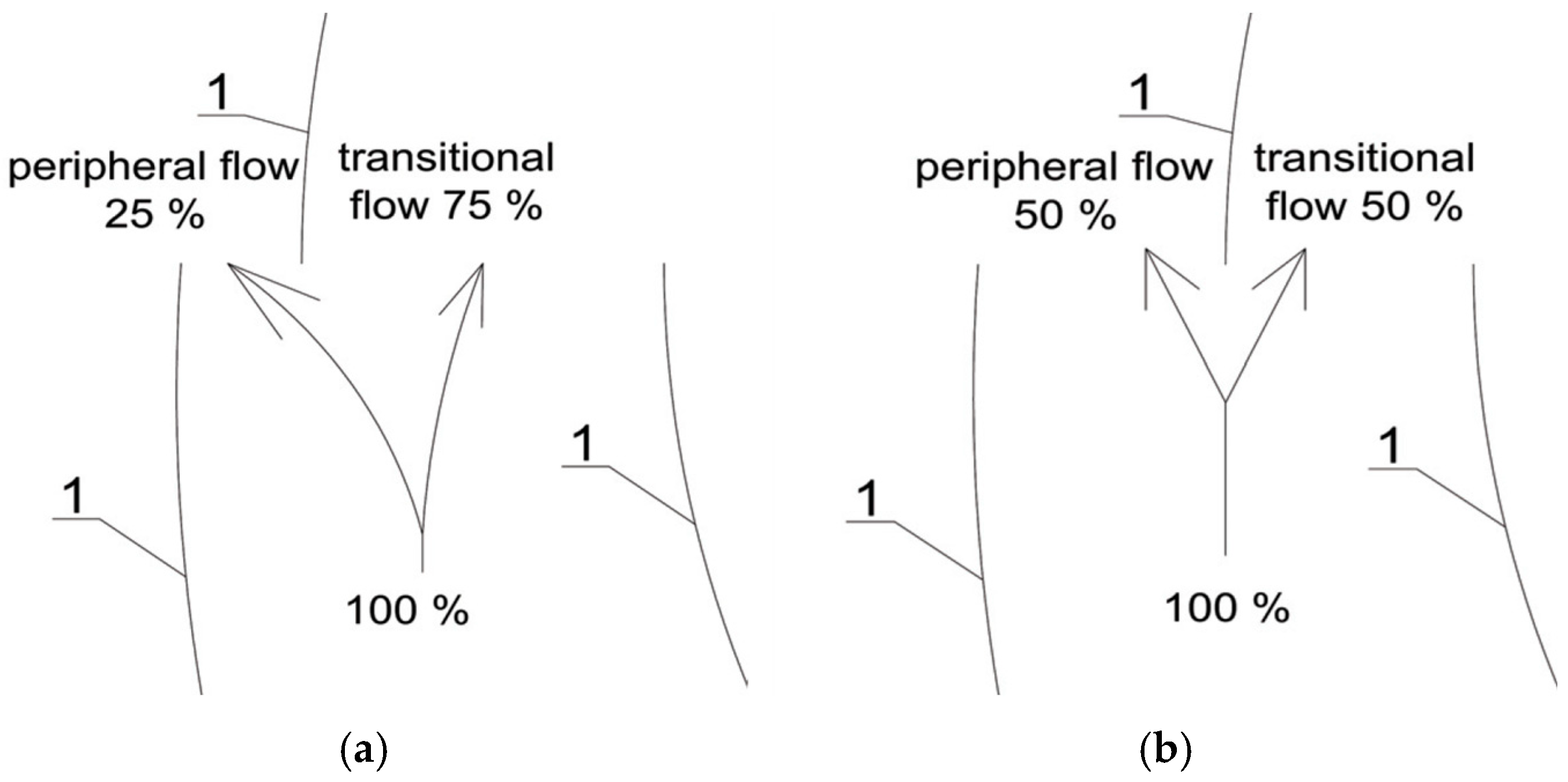 This flow ratio was selected as optimal on the basis of previous studies. To study aerodynamic drag and cleaning efficiency, additional studies were conducted with a predominant transit flow of 25/75, which, together with a flow distribution of 50/50, is one of the optimal ratios. This distribution is characteristic only of cyclones with internal channels, the design of which has not yet been thoroughly studied. However, there are studies that have concluded that one of the most effective cases is when the peripheral and transit flows are distributed equally, i.e., 50% each [