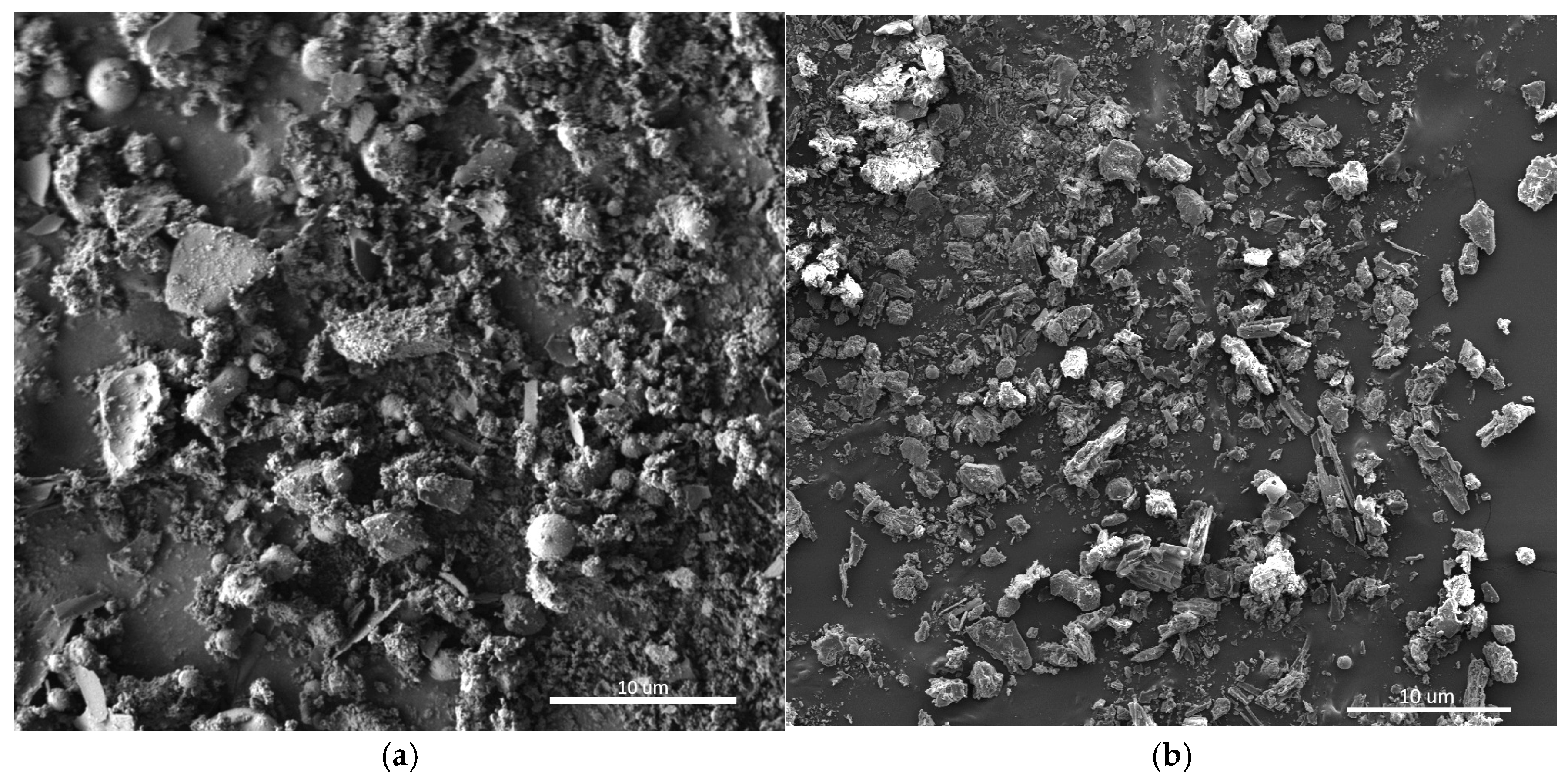 For experimental testing, a fraction of particles with a size of 0–20 μm was used. The rest was received. During the experimental studies, the ambient temperature ranged from 20.5 °C to 21.5 °C, and the relative humidity reached 42–46%. Visual size analysis was performed using a scanning electron microscope (SEM). SEM JEOL JSM-7600F (Jeol, Akishima, Japan), complete with a Quorum Q150R ES (Quorum, Edinburgh, UK) automatic sample preparation device, was used. Low-aberration objective lenses provide stable, high-resolution images even at high beam intensities (over 200 nA at 15 kV). This allows for high-precision analysis of nanostructures, with a magnification ranging from 25-fold to 10