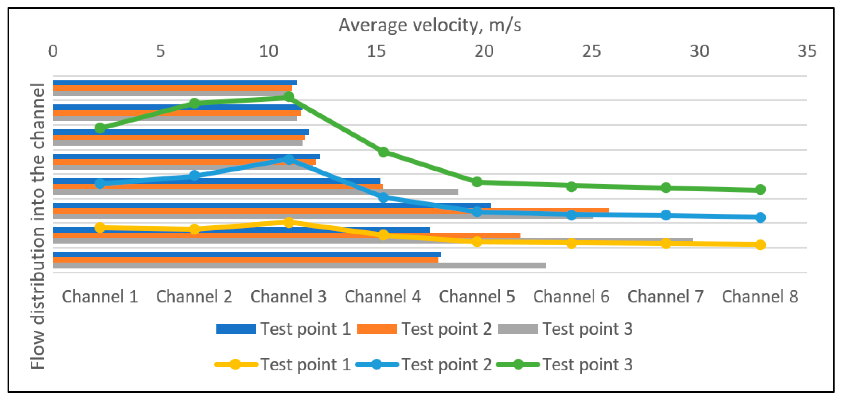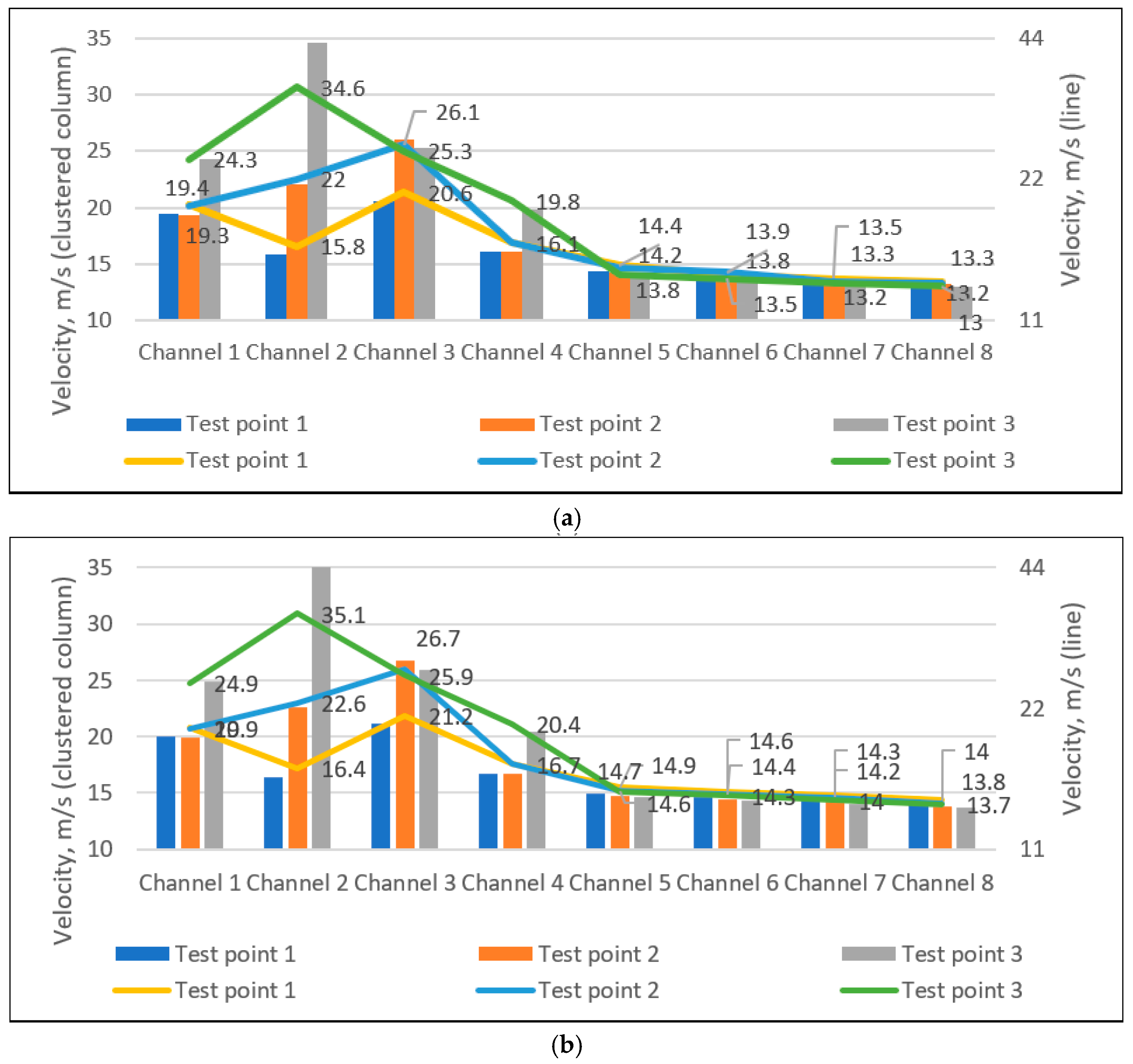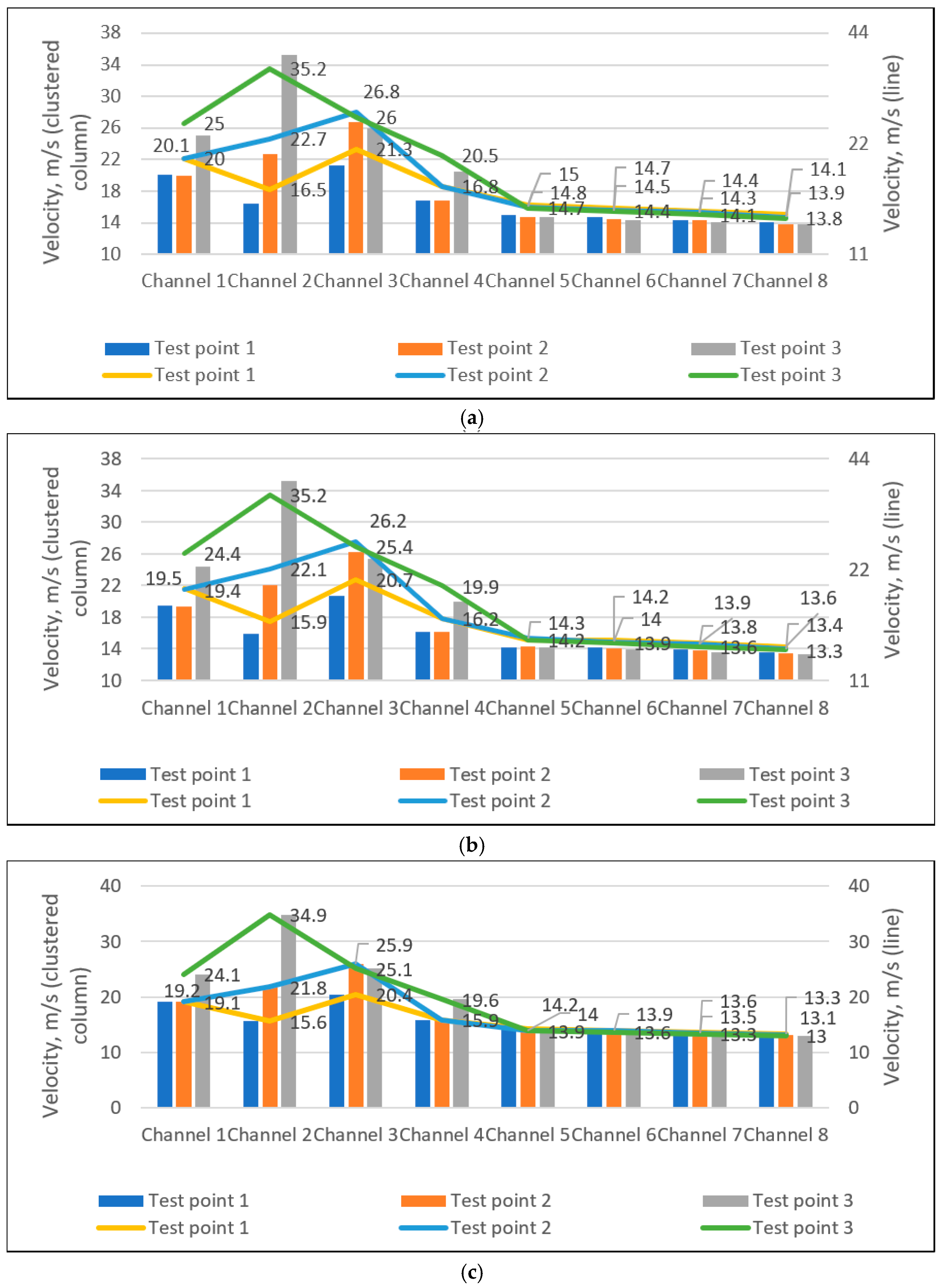 At all three levels, the difference between the average velocity of the fourth and fifth channels is approximately 0.8 m/s. When evaluating the internal channels of all three levels (channels 5–8), it can be seen that the decrease in velocity from the beginning of the channel to the end is uniform, and the values decrease by an average of 4–6%. The greatest decrease in velocity is observed in the fifth channel and reaches 5.9%.