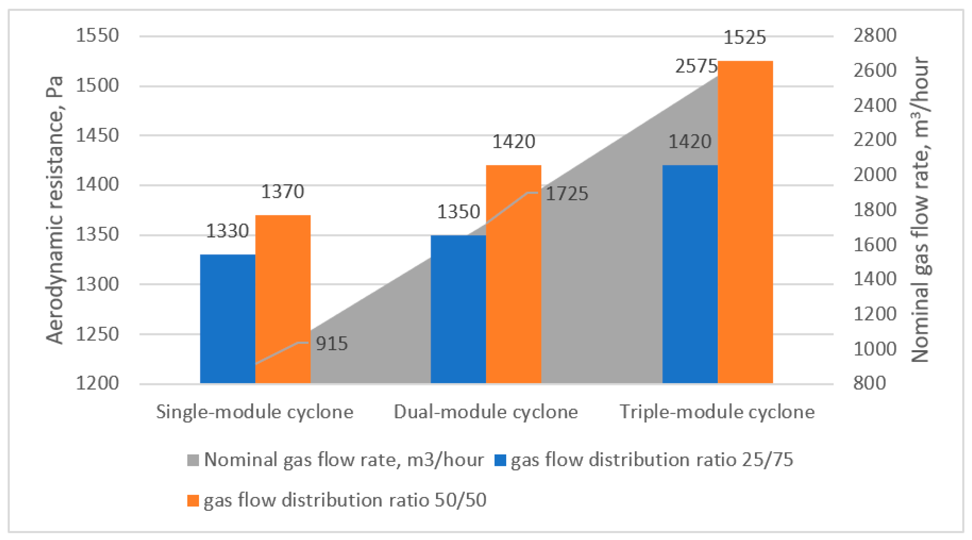 Figure 7. At an average gas flow velocity of 16 m/s in the cyclone-separator channels, it was found that with an equal flow distribution ratio of 50/50, the maximum aerodynamic drag reached 1525 Pa, which was established during the testing of a triple-module cyclone-separator. As a rule, aerodynamic drag decreases as the number of modules in the cyclone-separator design decreases. When comparing the aerodynamic resistance parameters of cyclone-separators with three- and dual-modules, it was found that the value decreased by 6.9% and reached 1420 Pa. However, when comparing two- and one-module cyclone-separators, the decrease in values was not so significant, with a difference of 3.5% between them.