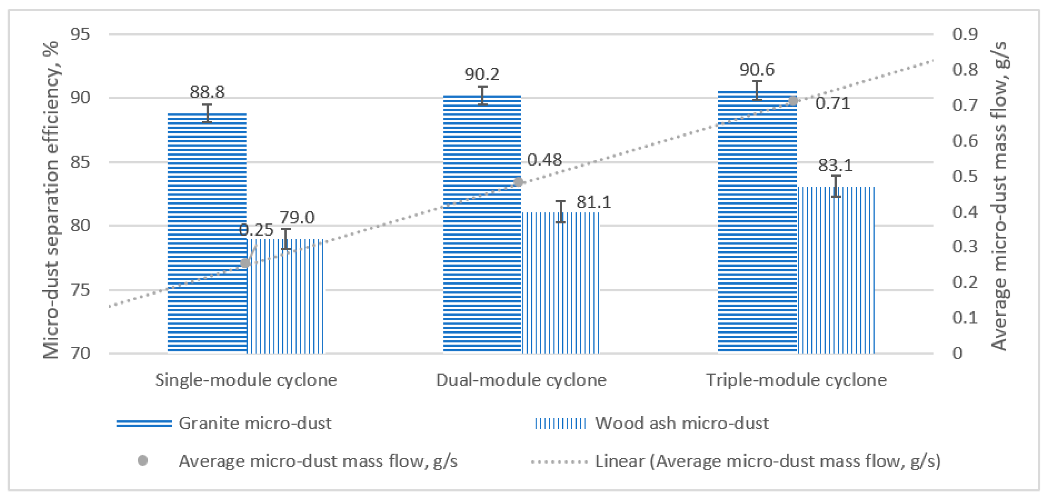 When analyzing the efficiency of cleaning a contaminated stream from wood ash micro-dust, whose dispersion is up to 20 μm, it was found that the maximum value is also achieved when using a triple-module eight-channel cyclone-separator and is 86.4% (the standard deviation is equal to 0.45). When using single- and dual-module cyclone-separators, the values are 3.5% (82.9% when the standard deviation is equal to 0.40) and 1.9% (84.5% when the standard deviation is equal to 0.42) lower, respectively. On the basis of the results obtained, it can be argued that the use of a multi-module eight-channel cyclone-separator design is significant and effective, especially for the separation of low-density micro-dust. The efficiency of separating wood ash particles in a contaminated stream increases to 4%, and high-density particles, such as granite ash particles, to 2%.