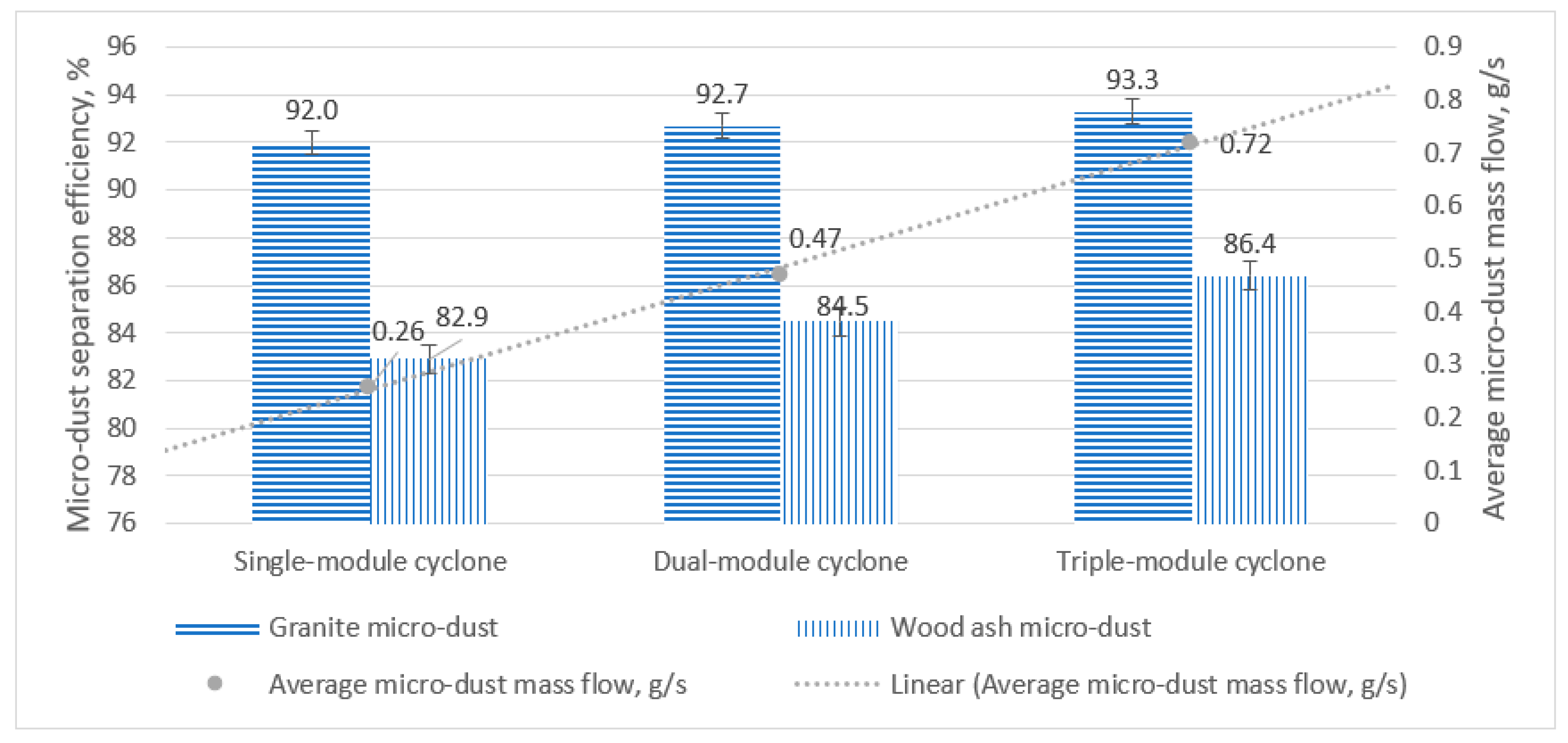 When comparing the efficiency of separating granite and wood ash from the gas flow in multi-module cyclone-separators, it can be stated that the average ratio was 1.11. The greatest difference was observed when studying the efficiency of single- and dual-module cyclone-separators. The smallest difference was noted for triple-module cyclone-separators. When the results obtained for the efficiency of purification using wood ash micro-dust are analyzed, it can be concluded that the trends remain the same as when using granite micro-dust. The highest efficiency was achieved using a triple-module multi-channel cyclone-separator design, which is equal to 83.1%. It should be noted that when comparing cases with single- and dual-module cyclone-separators, a significant decrease in efficiency values is observed, which was not noticed when analyzing granite micro-dust.