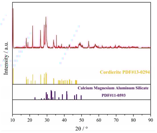 The SAC used in this experiment was provided by a precious metals recycling company in China. Figure 2 shows the XRD (D8 ADVANCE, BRUKER AXS GMBH, 8°/min) pattern of SAC. As can be seen, the main component of SAC is cordierite (PDF#13-0294). To increase the recovery rate of PGMs, it is necessary to reduce the content of PGMs in the slag phase as much as possible and improve slag–metal separation situation, both of which are related to the slag viscosity. At the same time, the smelting temperature should be reduced as much as possible to achieve low-temperature copper capture. This not only reduces energy consumption but also extends the service life of the equipment.