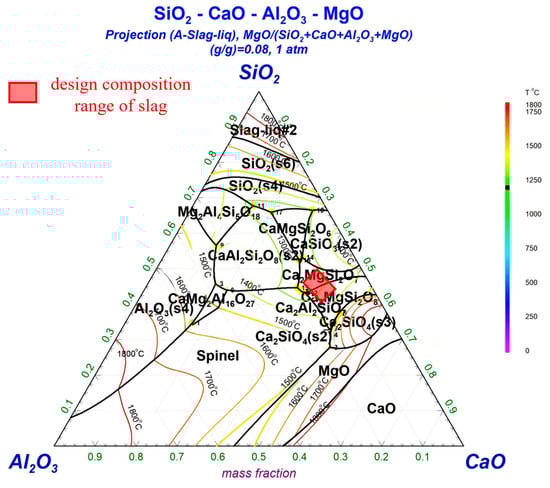 - Hou, Y.; Zhang, S.; Dang, J.; Guo, J.; Zhou, H.; Lü, X. Viscosity and structure relationship with equimolar substitution of CaO with MgO in the CaO-MgO-Al2O3-SiO2 slag melts. Int. J. Miner. Met. Mater. 2024, 32, 70–79. [Google Scholar] [CrossRef]
