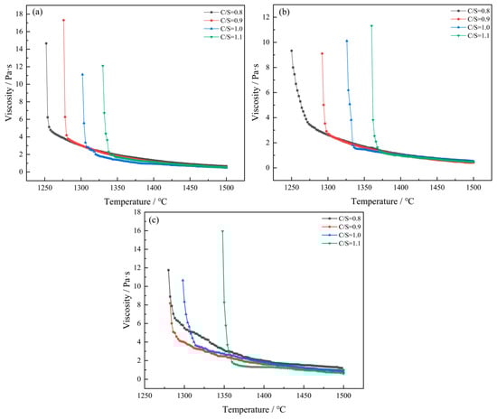 Viscosity–temperature curves of different CaO/SiO2 mass ratios under the condition of fixed Al2O3 content: (a) 10 wt% Al2O3; (b) 12 wt% Al2O3; (c) 15 wt% Al2O3.