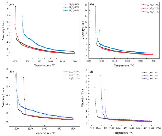 Viscosity–temperature curves of different contents of Al2O3 under the condition of fixed CaO/SiO2 mass ratios: (a) CaO/SiO2 = 0.8; (b) CaO/SiO2 = 0.9; (c) CaO/SiO2 = 1.0; (d) CaO/SiO2 = 1.1.