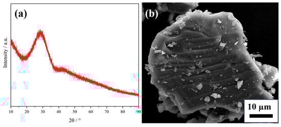 Considering the physical properties of the slag and the amount of slag produced comprehensively, 36.44 wt% CaO-45.56 wt% SiO2-12.00 wt% Al2O3-6.00 wt% MgO was selected as the target slag type for the capture experiment. An XRD test was conducted on the target slag system, and the result is shown in Figure 8a. No obvious characteristic peaks were observed in the spectrum, indicating that the slag is amorphous glass slag. Figure 8b describes the microscopic morphology of the slag. It can be found that no grains are found on the surface of the slag, which also indicates that the slag is amorphous.