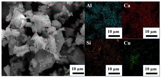 As can be seen from Figure 9, when the dosage of the collector Cu is 8%, Cu cannot fully contact the PGMs, thus resulting in a very small recovery rate of Pt, Pd, and Rh, not exceeding 85%. When the amount of metal to be captured is 10 to 12 wt%, the recovery rate significantly increases compared to 8 wt%. This indicates that increasing the amount of the collector can effectively enhance the contact and collection probability of copper with PGMs, thereby significantly improving the recovery efficiency of PGMs. When the captured metal amount reached 12 wt%, the recovery rates for Pt, Pd, and Rh were 96.3%, 96.12%, and 95.52%, respectively. When the Cu content was 14 wt%, the recovery rate did not change much. This phenomenon might be due to excessive Cu use, which led to collector aggregation and reduced the effective contact surface area. From the SEM image and EDS spectrum of the slag at a Cu dosage of 14 wt% presented in Figure 10, it can be observed that, in contrast to the uniform distribution of Al, Ca, and Si within the slag matrix, Cu exhibits a certain degree of aggregation. Moreover, the increased Cu dosage did not correspondingly increase the number of PGMs that could be collected. Additionally, considering the relatively high price of Cu, excessive use of Cu not only increases the production costs. Moreover, it increased the difficulty of separation in the subsequent smelting process. Eventually, it was determined that the amount of copper collector added to the SAC was 12 wt%.