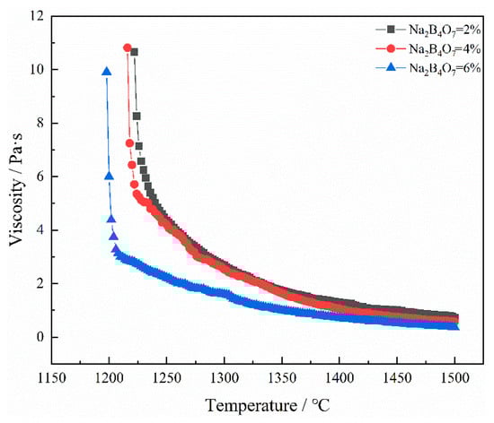 Viscosity–temperature curve of slag without Na2B4O7 content.