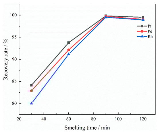 As shown in Figure 14, when the smelting time is 30 to 60 min, the recovery rate increases significantly. When the smelting time was 90 min, the recovery rate reached its maximum, indicating that the optimal reaction conditions were achieved. However, as smelting time continued to increase, the recovery rate of PGMs decreased slightly. This is attributed to the fact that the recycling process is carried out in an air environment. The Cu-PGMs alloy is prone to oxidation and mixing into the slag in an air environment, resulting in a slight decrease in the recovery rate of PGMs. Moreover, an excessively long smelting time will increase the solubility of PGMs in the slag.