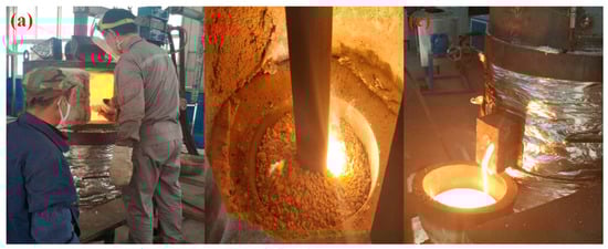 To verify the feasibility of optimizing slag type and process conditions, three sets of pilot tests were conducted using the previously optimized slag composition and process parameters. The chemical composition of the SAC used in the pilot-scale experiments is presented in Table 1. The concentrations of Pt, Pd, and Rh are 310, 2140, and 320 g/t, respectively. A total of 30 kg of SAC was added for each experiment. After mixing the SAC with fluxing agents, collecting agent, and reducing agent, the mixture was charged into an electric arc furnace, with the experimental temperature maintained at approximately 1450 °C. After allowing all materials to melt for about 90 min, the slag and metal were discharged from the furnace. The experimental procedure is illustrated in Figure 16. The recovery rates of PGMs are presented in Table 4. The recovery rates of all three groups of experiments exceeded 99%, indicating that this technology has industrial application potential.
